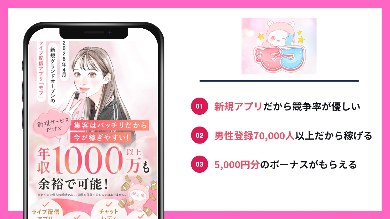 モフは2026年4月に正式リリースしたばかりの新規アプリのため、男性客を集めるために広告費をたくさん使っているのでチャンスが増えています。